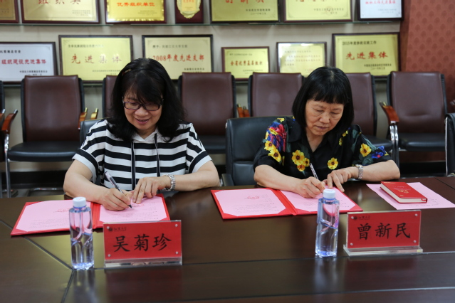 吴菊珍代表江汉大学教育发展基金会与曾新民签订了捐赠协议,并颁发捐赠证书。吴学军为曾新民颁发基金会纪念手册。