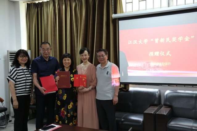 6月13日上午,江汉大学“曾新民奖学金”捐赠仪式在J16教学楼C308会议室举行,捐赠20万元人民币设立奖学金奖励品学兼优的学生,激励青年学子成长成才。