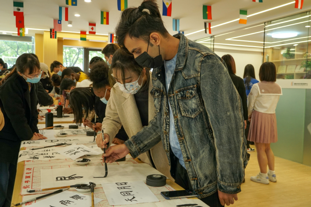 为进一步加强中外师生的文化沟通和交流,丰富校园生活,构建国际化多元校园文化,4月16日,江汉大学“第五届国际文化节”系列活动——“翰墨韵”中国书法体验展示活动在国际文化交流活动中心举行。国际教育学院、美术学院及人文学院的30余名中外师生以书法会友,以墨笔续情,共同体验中华传统文化的魅力。