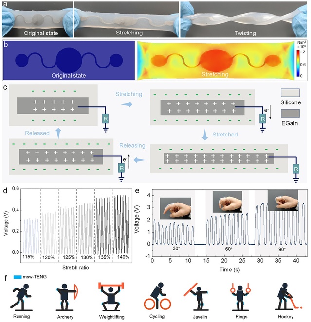 在运动人体科学领域,监测人体运动生物力学和生理功能参数对评估运动负荷与身体机能具有重要科学意义。但目前流行的可穿戴电子设备存在功耗较高和体积较大等问题,这些因素限制了设备的长时程监测运行及应用。为了弥补目前现有穿戴设备的不足,该研究提出了一种基于生物机械能收集及生物力学和生理功能传感的多模态可穿戴器件(msw-TENG)。该器件由液态金属和硅胶设计制成(0.3 cm × 1.5 cm ×5 cm),不仅同时实现了可拉伸、高导电性及与皮肤的保形接触,而且可将肢体运动的生物机械能转化为电能,实时检测桡动脉脉搏信号、关节弯曲角度和肢体稳定性等重要生物医学参数。作为一种无需额外电源、体积小巧的多功能生物医学传感器件,在未来的运动训练监测和康复治疗中具有较大的潜力和广泛的应用前景。