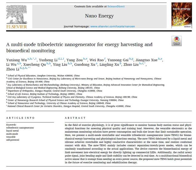 近日,我校体育学院吴钰祥副教授团队在国际顶级期刊《Nano Energy》(中科院分区SCI一区,SCI影响因子17.88)发表了题为《A multi-mode triboelectric nanogenerator for energy harvesting and biomedical monitoring》的重要研究成果。吴钰祥副教授为该论文的第一作者和第一通讯作者,徐国栋教授和2019级硕士研究生吴礼为共同作者,江汉大学为第一作者单位和通讯单位。