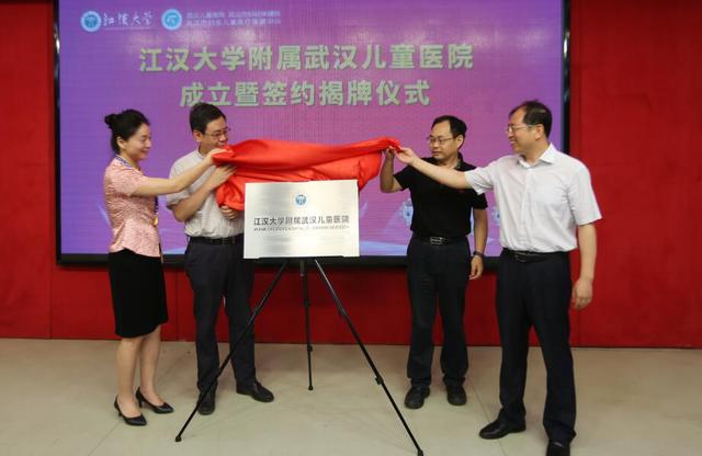 市卫计委党委书记朱宏斌和我校党委书记李强、校长张幸平以及儿童医院书记关爱民共同为江汉大学附属武汉儿童医院揭牌。
