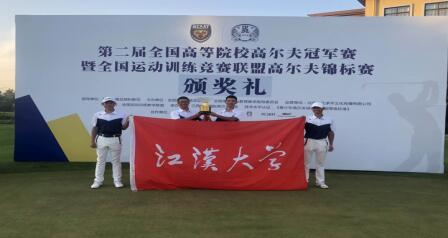 5月17日至5月23日在江西共青城庐山国际高尔夫球会举办的“第二届全国高等院校高尔夫冠军赛暨全国运动训练竞赛联盟高尔夫锦标赛”中,江汉大学高尔夫球队荣获男子团体(向秋、周毅、朱进虎、邵虎)亚军、女子团体(陈平、张倩、关玲玲、高云)季军,向秋荣获男子个人亚军,钟璧蔚和朱黎明教师荣获教学技能大赛一等奖,展现了良好的精神风貌。