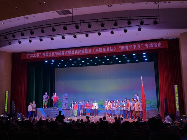为积极响应省教育厅“高雅艺术进校园”和市委市政府“新青年下乡”文艺下乡活动要求,在校园内营造良好的文化氛围,5月30日下午,校团委联合湖北省歌剧舞剧院组织开展了“江汉之春”校园文化节闭幕式暨经典民族歌剧《洪湖赤卫队》“新青年下乡”专场演出。活动在学术交流中心明德厅举行,副校长张英、师生代表和武汉开发区(汉南区)居民800余人参加了活动。
