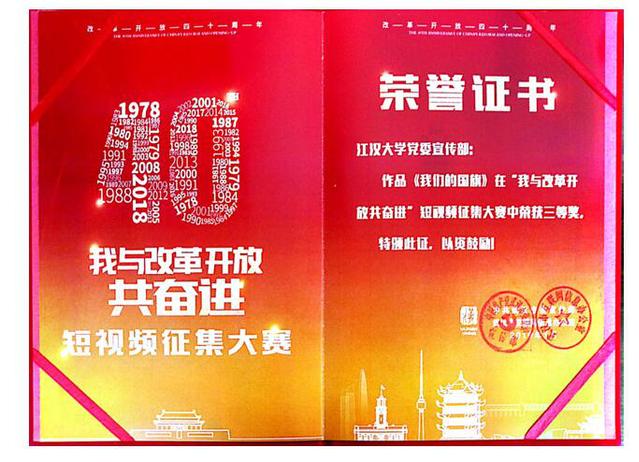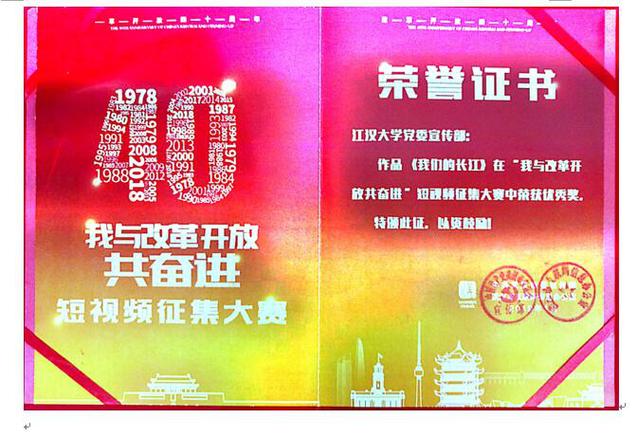 近日,在由中共武汉市委宣传部、武汉市互联网信息办公室主办的“我与改革开放共奋进”短视频征集大赛中,我校党委宣传部作品《我们的国旗》荣获三等奖,作品《我们的长江》荣获优秀奖。