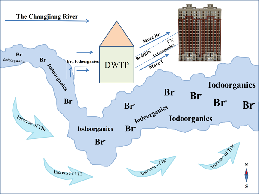 含溴碘消毒副产物引起高毒性而受到广泛关注,研究供水系统中溴碘的形态对于此类物质的安全评估具有重要的指导意义。该项研究工作首次研究了长江沿岸多个城市供水系统中的溴碘形态的赋存及转化。研究表明,溴碘在长江沿岸饮用水系统中广泛存在,浓度从上游至下游呈增长趋势,经水厂处理后的水样中的溴碘浓度明显高于源水中溴碘的浓度,其增长可能来源于含氯消毒剂的使用,含溴碘的卤水是含氯消毒剂的主要生产原料,溴离子是源水中溴的主要形态,经水处理后50%以上的比例转化为了有机溴,有机碘是源水中碘的主要形态,经水处理后部分转变为碘酸根。长江中的溴碘呈增长趋势且有机溴碘在水厂处理后的水样中占有较高比例,所以溴碘带来的问题不容小觑,仍需进行深入研究。