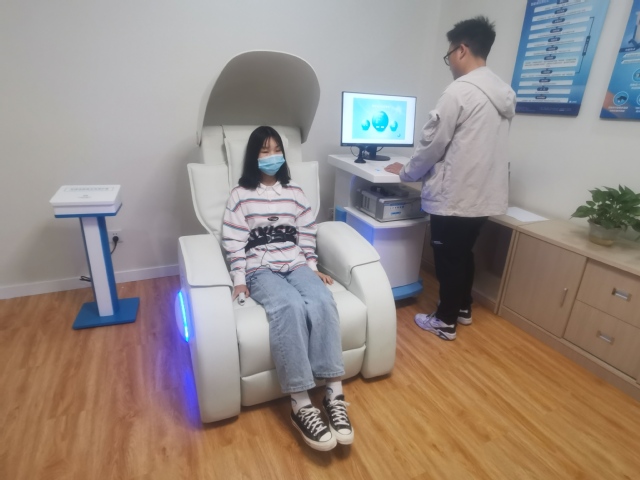 “心口不一”活动中参与者必须做出和裁判口令相反的动作;“解忧杂货铺”的展台前学生们纷纷在卡片上写下自己的小烦恼,然后挑选一两张其他同学的卡片,写上鼓励的话;“你来比划我来猜”考验的是一对合作者之间的默契度。24项户外活动,每参加完一项就能得到一枚小印章,积攒到一定数量的小印章可以兑换精美的心理健康宣传礼品。在现场心理咨询体验展台前,每位咨询老师前都接待了数位前来体验心理咨询的学生。教学楼J10内以浅黄、浅绿、浅蓝、浅粉、浅紫等明亮温馨的色彩为装修主色调,为前来咨询的学生们营造出一种自在、放松的氛围。自去年9月改建完成后开始接待学生以来,这里越来越受到学生的欢迎,除了心理咨询,日常也是爱自拍的同学们的拍照打卡地。开放日里,这里也迎来了众多前来体验的同学。虚拟现实室的设备类似于4D游戏舱,通过构建沉浸度高的虚拟现实环境,监测到的咨询者的心理状态和各项心理指标来制定干预计划。个体沙盘室运用心理沙盘游戏对学生开展心理辅导。音乐放送室利用音乐放松椅,使来访者在舒适、平静的状态下接受咨询。