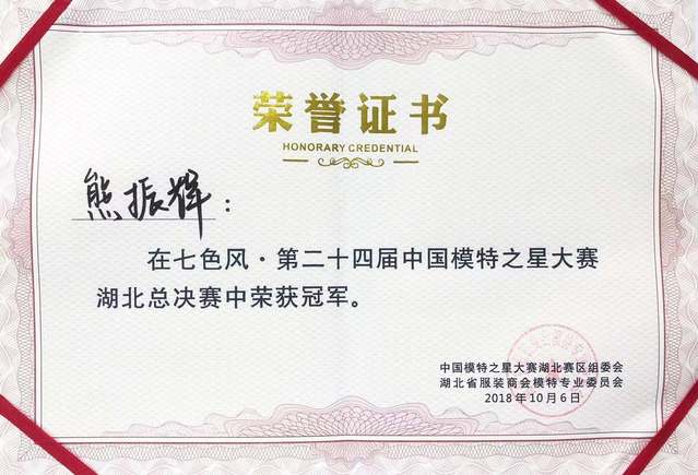 熊振辉从人数众多的海选中脱颖而出并获得湖北省赛区冠军,前往北京参加全国总决赛。与全国各地区选拔出来的110位选手比拼后,成功晋级50强,并在总决赛的泳装、时装、礼服项目中均表现出色,斩获“十佳模特奖”。通过此次参赛,这位刚上大二的“新星”,在舞蹈、形体、气质、走台等各方面都有了进步和突破,在比赛中展现出良好的精神面貌和专业风采,受到评委的一致好评。