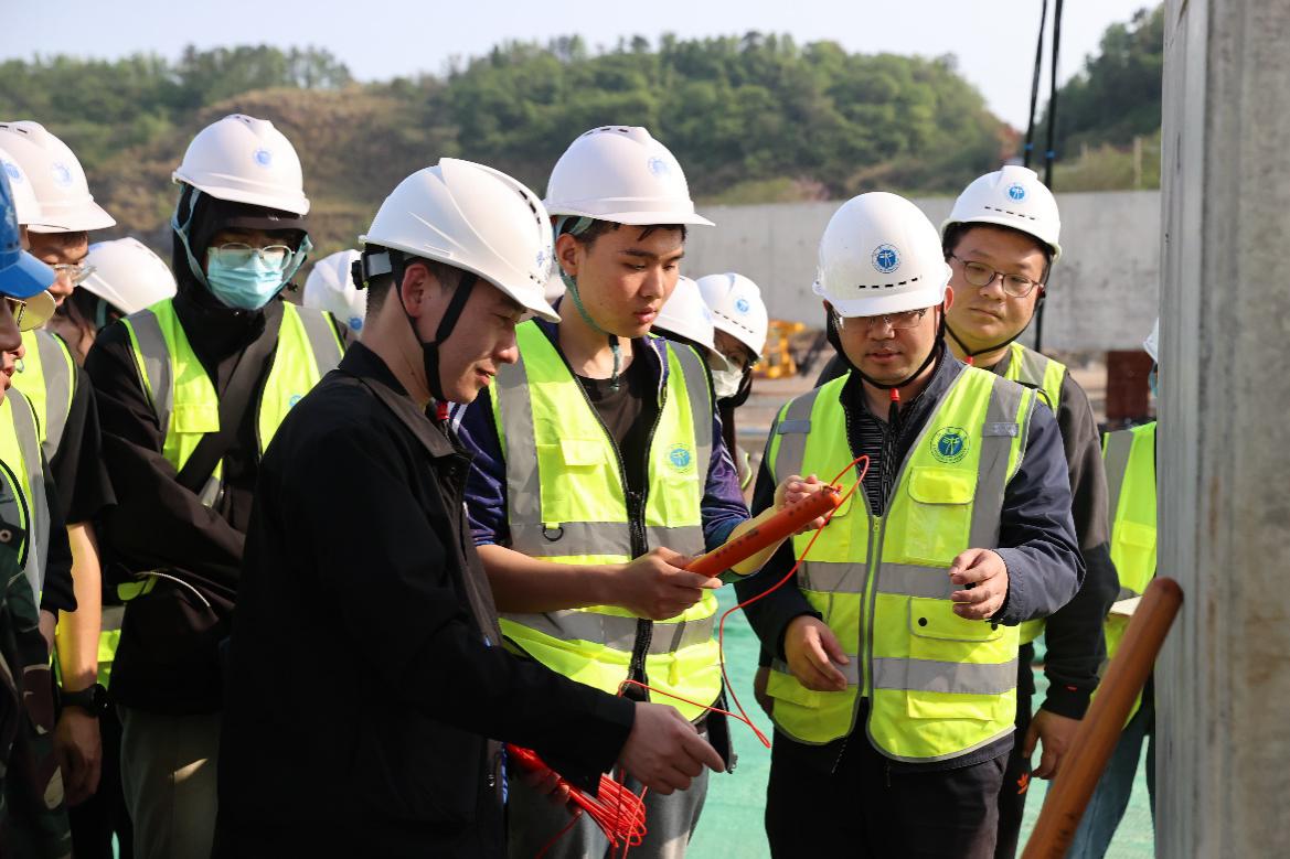 贾永胜教授还利用实验现场钢筋混凝土梁柱构件模型、乳化炸药和数码电子雷管等器材,为学生讲解了数码电子雷管起爆系统的工作原理。董千、年鑫喆、黄小武等老师结合乳化炸药的装药环节,向学生讲解了实操过程中的注意事项和安全规范。