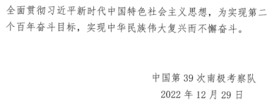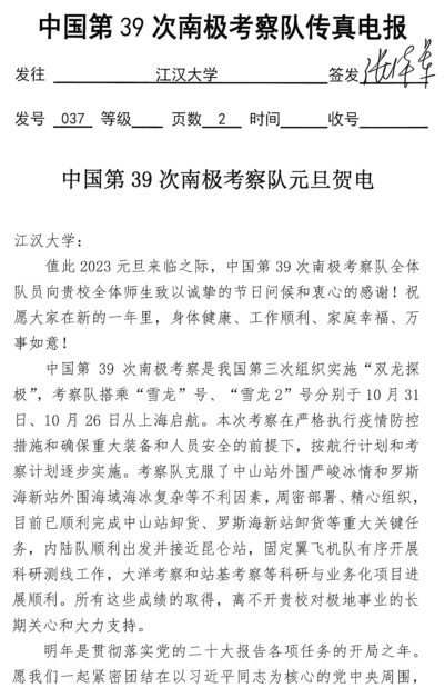 12月29日,中国第39次南极考察队全体队员向江汉大学全体师生以传真电报形式发来2023年元旦贺电。江汉大学环境与健康学院潘钰老师参加了本次考察。