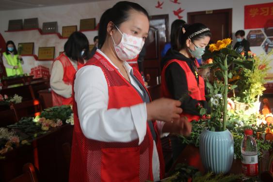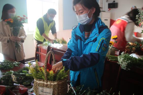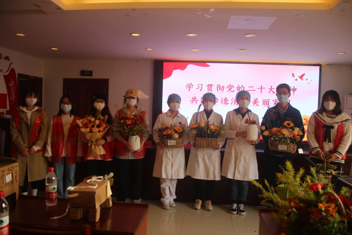 在作品展示环节,绿舟环保志愿者协会指导老师王鹏带领志愿者展示了手工作品。他们通过快递纸箱、口罩、棉签等废弃物,为大家呈现了一幅幅创意十足的手工作品,让大家感受到了废弃物品循环利用的美好和价值。园艺协会的同学将亲手制作的花蓝献给了在疫情防控工作一线的社区医务工作者,感谢他们的辛勤付出。