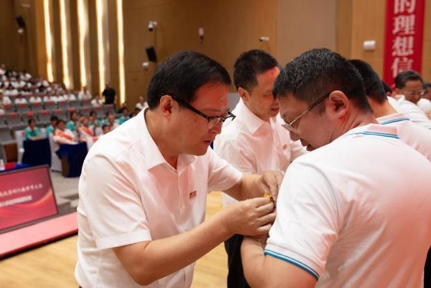 全体校领导为新入职教师代表佩戴学校徽章。覃道明为全国优秀教育工作者周昕,2024年“荆楚好老师”胡长峰,湖北“五一”劳动奖章、武汉“五一”劳动奖章左治江,“荆楚工匠”戴希刚,武汉“五一”劳动奖章李煜宇,湖北省博士服务团优秀个人黄碧捷佩挂绶带。