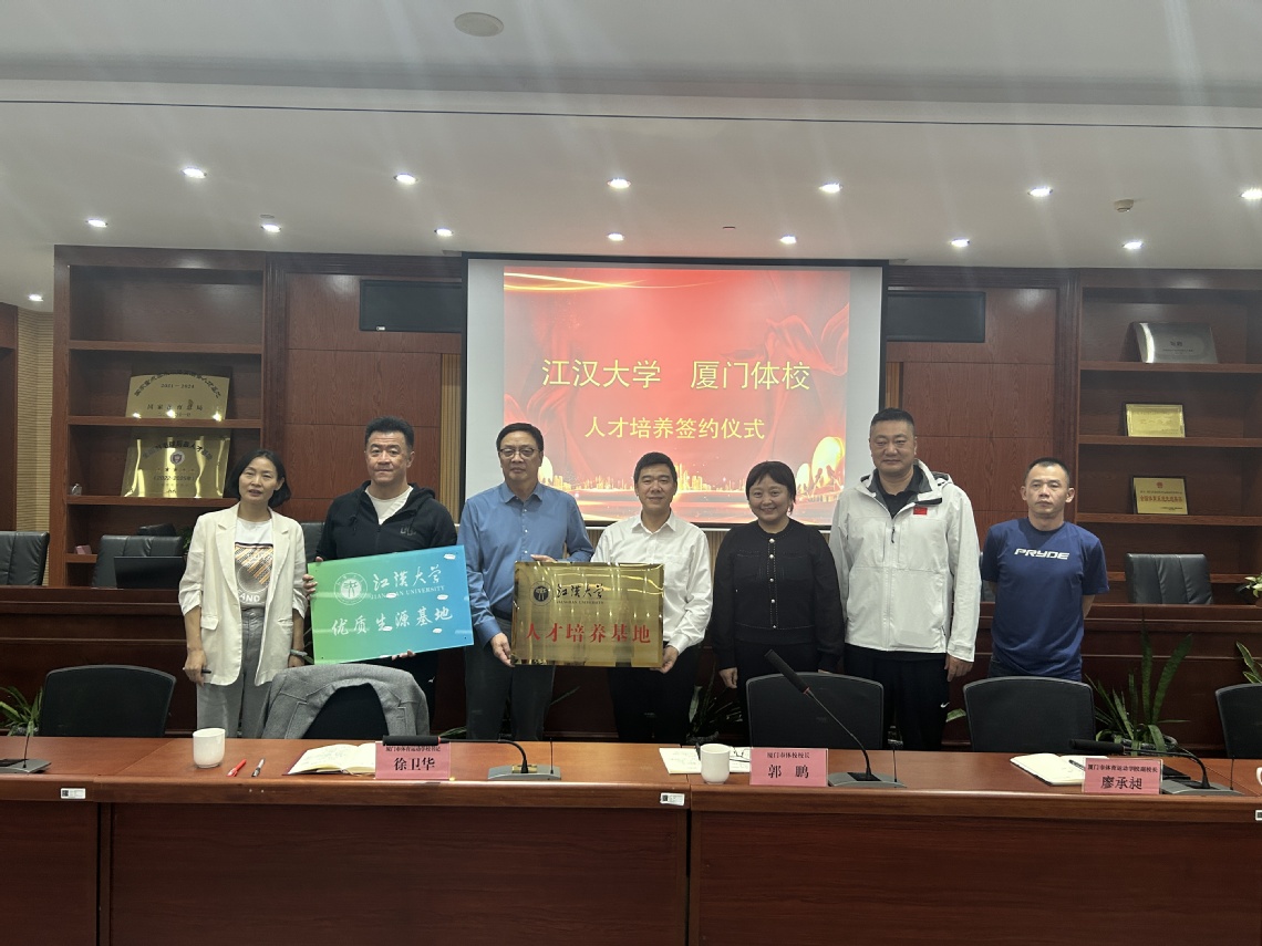 在座谈会上,厦门市体育运动学校党总支书记徐卫华对李卫东一行表示热烈欢迎,并介绍了学校的建校历史和基本情况。李卫东介绍了学校历史、学科建设、师资队伍及人才培养质量等基本情况。他说,厦门市体育运动学校作为国家重点高水平体育后备人才基地,持续为江大输送了像叶贵桐为代表的优质生源,期待两校继续在招生、实习实践等方面进一步加强合作。体育学院负责人就学院情况、招生计划做详细介绍。双方共同签署了优质生源基地合作协议和校外人才培养基地协议并授牌。