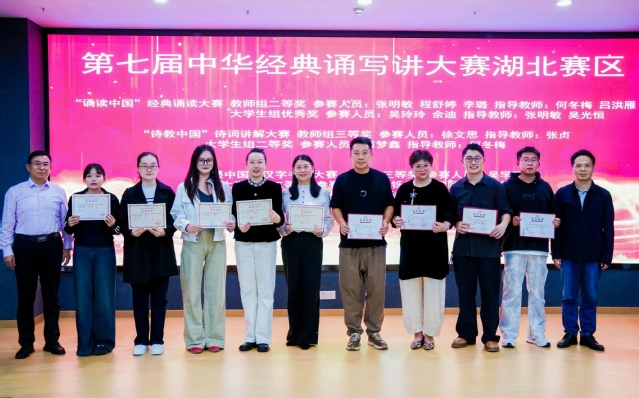 在第七届中华经典诵写讲大赛“诵读中国”(湖北赛区)中张明敏、程舒婷、李璐荣获教师组二等奖(指导教师:何冬梅、吕洪雁),吴玲玲、余迪获大学生组优秀奖(指导教师:张明敏、吴光恒);在“诗教中国”(湖北赛区)中徐文思获教师组三等奖(指导教师:张贞)、项梦鑫获大学生组二等奖(指导教师:何冬梅);在“笔墨中国”(湖北赛区)中吴学聪获教师组三等奖、吴铄获大学生组软笔二等奖(指导教师:柳国良)、杜登科获大学生组硬笔二等奖(指导教师:赵国臣)。
