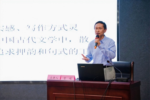 武汉理工大学副研究员、国家级普通话水平测试员雷峻以“浅谈古诗文朗诵”为题,以自身与古诗词结缘的故事为切入点,深情讲述了他对古诗词朗诵艺术的热爱与执着追求。雷老师是教育部中华经典诵读工程专家库成员,湖北省朗诵艺术家协会理事。他围绕“如何让古诗词朗诵更具感染力”,从气息调控、语音锤炼、情感融入等方面展开。在雷老师声情并茂的演绎里,满座听众都沉浸在古典诗文的美妙意境之中。
