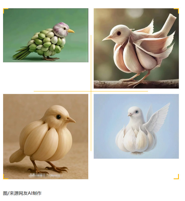近日,一段视频在网络走红。视频中,重庆动物园的两只大熊猫在木桩上撕咬玩闹,画外响起武汉话“蒜鸟,蒜鸟,都不容易”的劝架声。“蒜鸟”由此引发网友浓厚兴趣,大家借助AI制作出形态各异的“蒜鸟”造型,并亲切地称其为“和平鸟” 。
