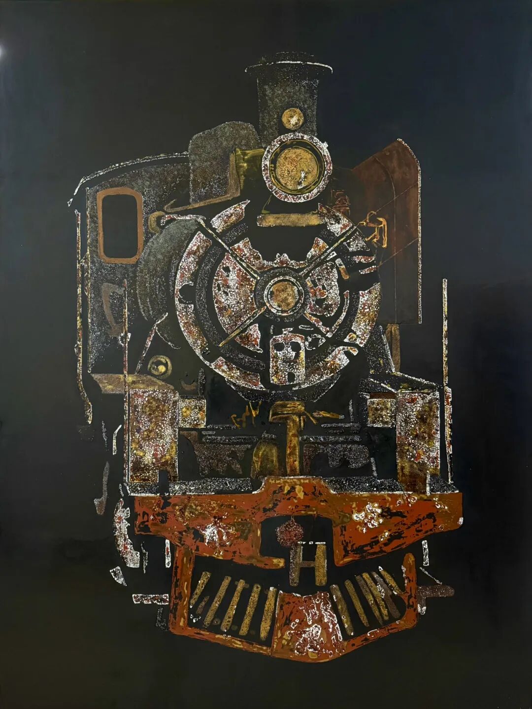 漆画《前进》在众多参选作品中凭借其独特的艺术语言与深厚的精神意蕴脱颖而出,跻身国家级文化艺术盛会。作品以蒸汽火车为核心意象,选取极具视觉张力的纯正面视角,将这一工业文明的标志性符号,塑造为一座迎面矗立的“钢铁丰碑”。创作手法上,摒弃繁复色彩,以大漆特有的玄黑为基调,通过反复髹涂、精心打磨等传统工艺,使漆层在画面中呈现出温润而厚重的质感,笔触间既见钢铁结构的冷峻棱角,又流动着大漆材质独有的微光,为冰冷的机械意象注入人文温度。