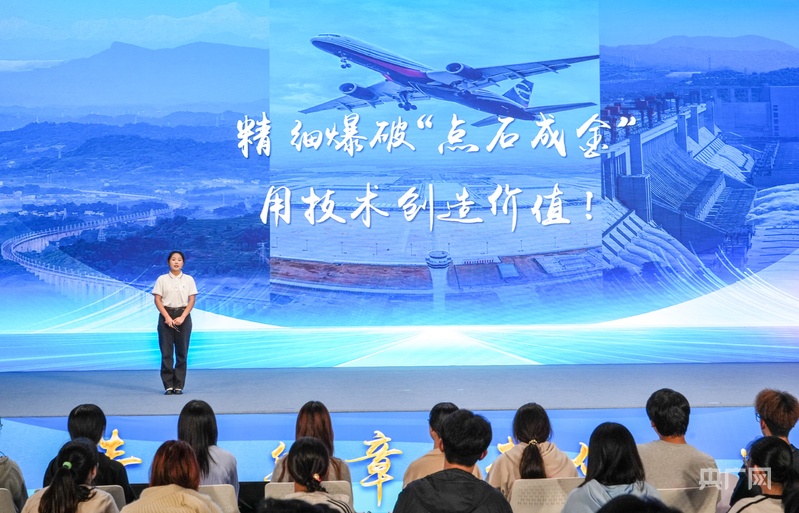 在川藏铁路,团队驻扎海拔4000米高原,研发“机械化装药技术”,将单次爆破进尺从2.6米提升至5.1米;在鄂州花湖机场,他们用“台阶爆破”将三座大山夷为平地,却让周边居民楼的玻璃“一丝未动”;在汶川地震等灾害中,他们用爆破技术开辟生命通道,成为“危难时刻的生命守护者”。演讲中,张淑童与她的导师——精细爆破全国重点实验室谢全民教授共同讲述了“精细爆破”如何支撑起国家重大工程,赢得现场学子一片掌声。