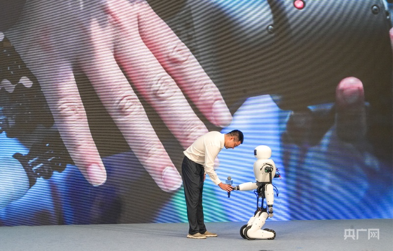 赵兴炜从机器人手中接过话筒(央广网记者邓子依 摄)