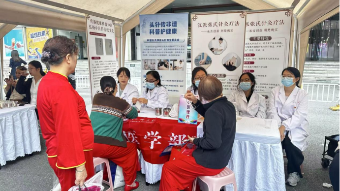 义诊过程中,中医教师们还重点介绍“汉派张氏针灸疗法”非遗项目。该疗法秉承《内经》“三因制宜”思想,由第五代核心传承人、江汉大学张红星教授创立“三快”针刺手法,构建“辨证-操作-评估”一体化诊疗体系,擅长治疗因湿热引发的痹症、代谢异常等荆楚地区高发疾病。中医老师们细致讲解其理论与临床价值,不少参与者表现出浓厚兴趣,现场体验并咨询相关调理方法。