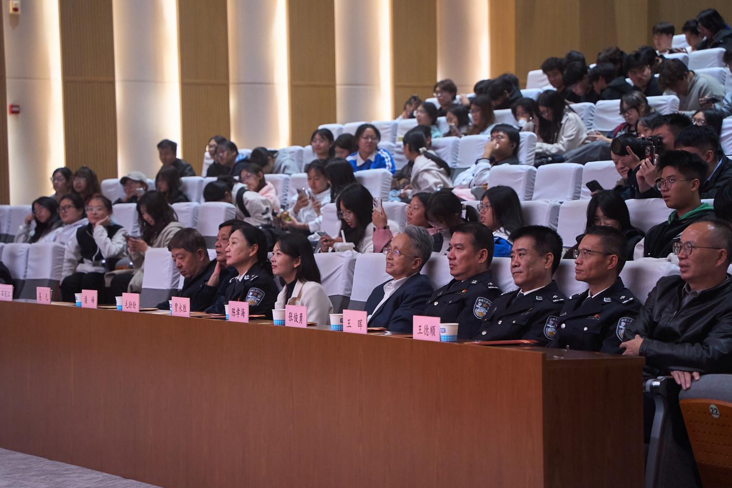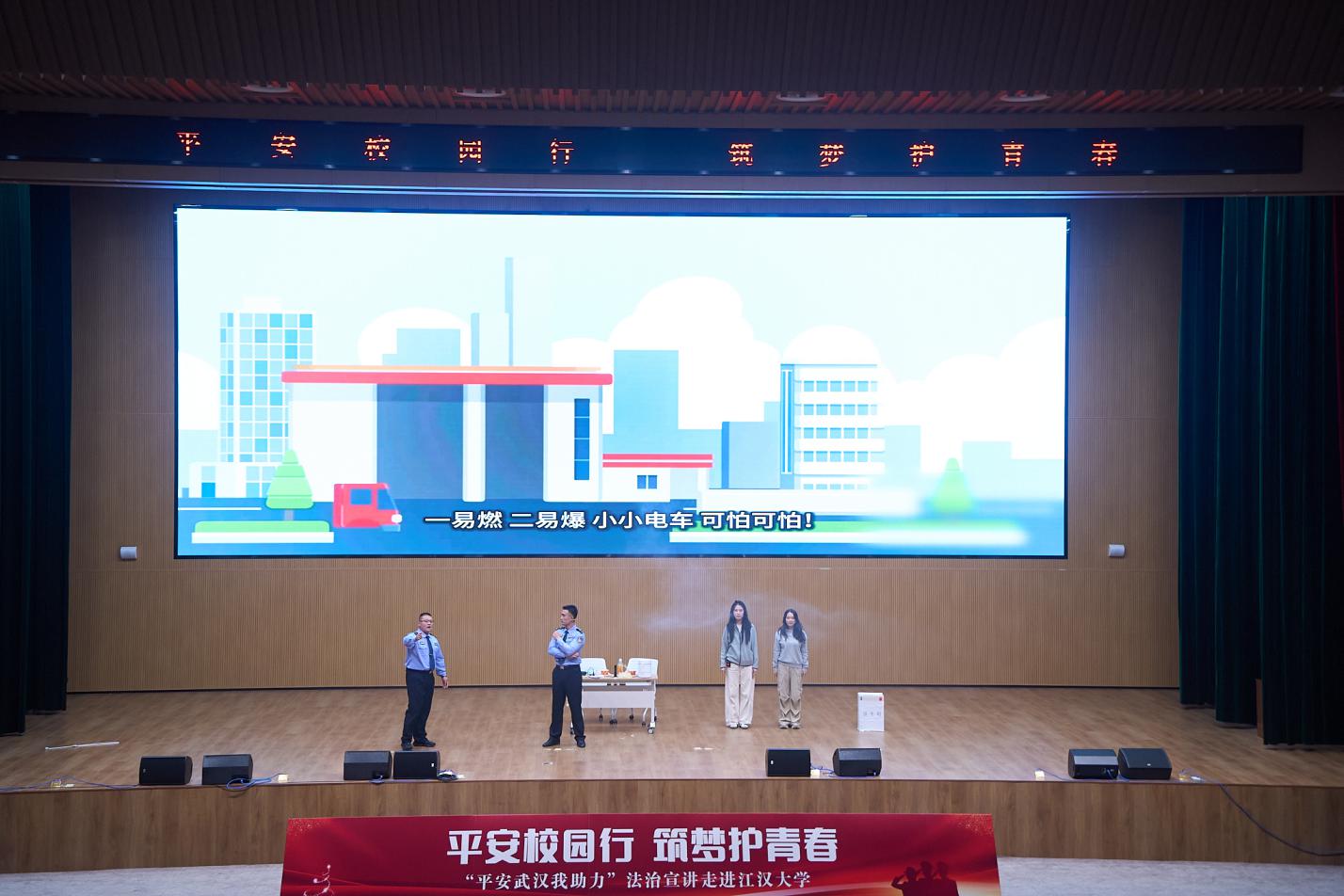 东湖新技术开发区、江夏区、青山区、公安分局、长江新区、武汉经济技术开发区的公安分局,以及轨道交通公安分局以情景剧、安全宣讲、技能表演等多种形式为我校师生进行了包括反诈、交通安全、消防安全在内的法治教育宣传。我校学子也献上了精彩的歌舞,现场一派警校互动、和谐融洽的良好气氛。