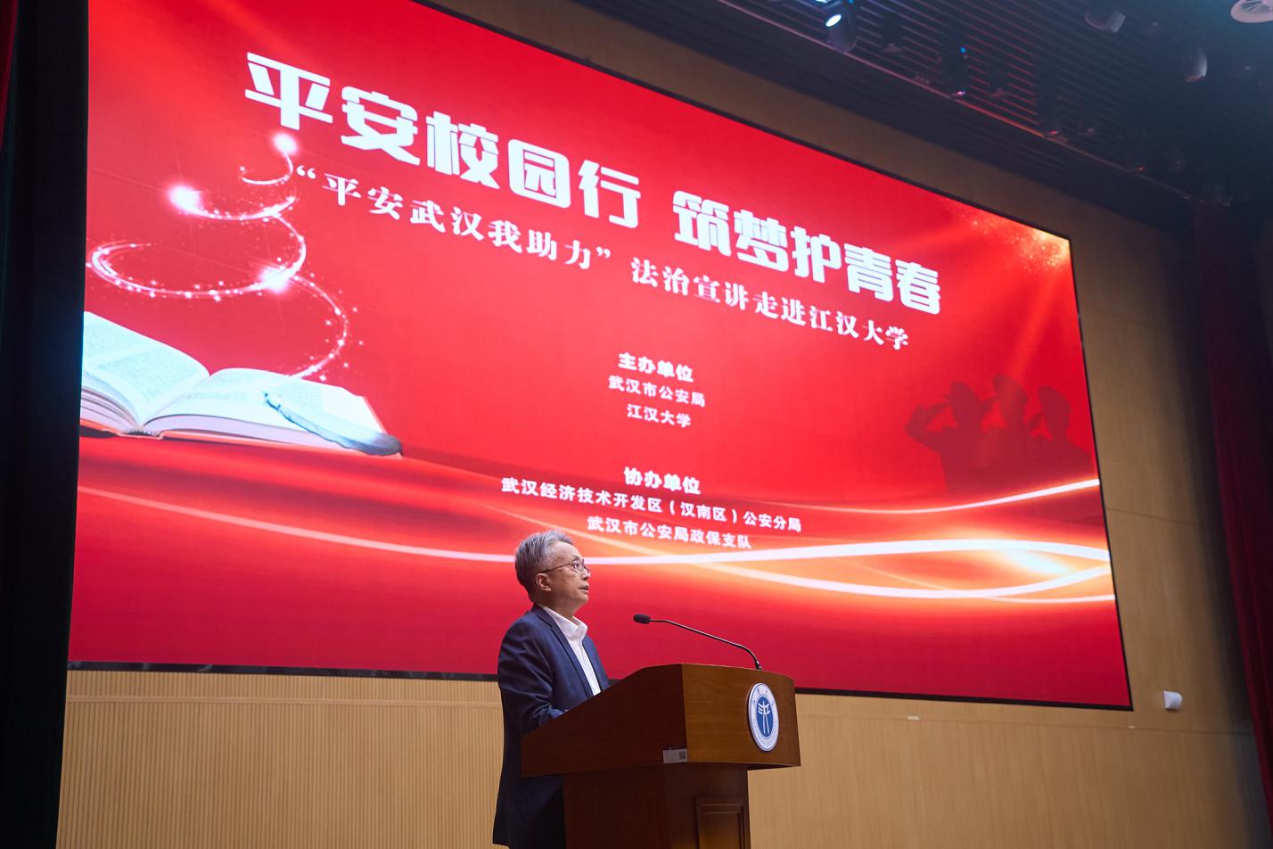 江大新闻网讯 10月30日下午,“平安校园行、筑梦护青春”法治宣讲演出活动在我校科创大楼江大厅举办。武汉市公安局党委委员、政治部主任陈孝海、我校副校长贾永胜出席活动。