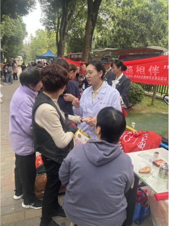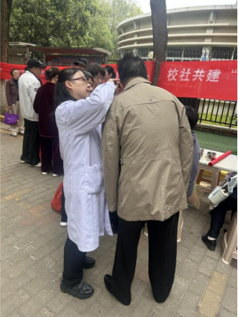 随后,在社区举办重阳节的系列活动。医学部联合附属医院(车谷院区)组织了强大的中西医专家阵容,为社区居民带来了“家门口”的医疗义诊服务。中医展台,来自中医学院的内科、妇科、针灸推拿专业的教师专家们运用“望闻问切”四诊合参的方法,为居民进行体质辨识,结合重阳节“秋冬养阴”的传统养生理念,给出个性化饮食起居和运动调养建议。现场还设置了耳穴压豆(王不留行籽)体验区,吸引众多居民尝试。针灸推拿专业教师则为颈肩腰腿痛的居民提供简易推拿和穴位指导,立竿见影的效果引得交口称赞。西医展台,附属医院(车谷院区)的临床专家团队为居民提供基础体检和口腔、皮肤、疼痛等多个专科的义诊服务。专家们一对一为居民进行健康咨询和初步诊疗,耐心解答大家关于常见病和多发病的疑问。