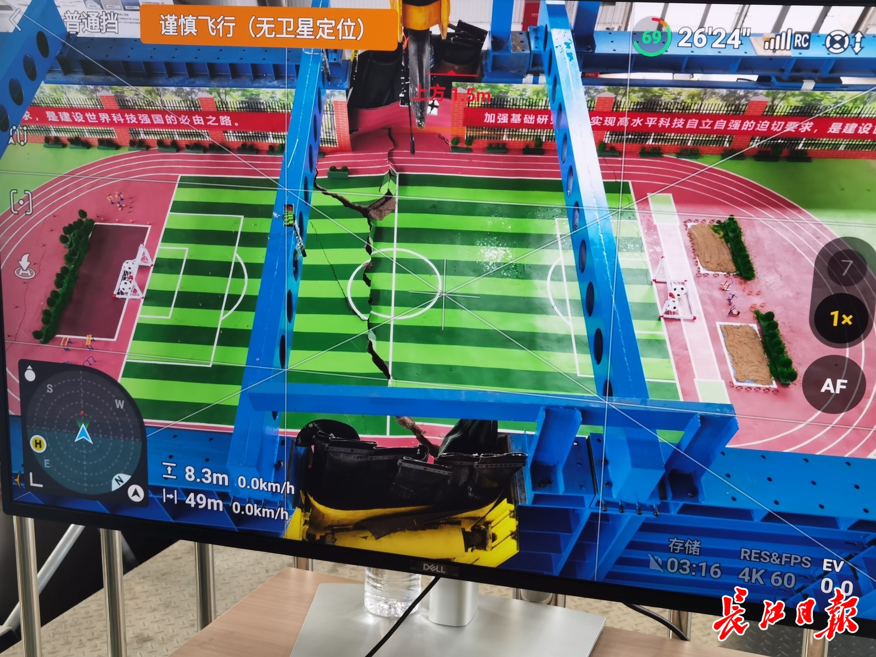 当日上午10时30分许,随着电源启动,装置发出沉闷的声响,一座70平方米的小足球场突然从中间一分为二,一角出现坍塌。不一会儿,监控屏幕上显示地质断层中深埋的隧道壁出现裂纹,地震预警系统红灯亮起、鸣笛警示。同时,装置中500余个传感器将检测数据传输到监控中心,深埋在岩层中的隧道内外变化通过各种数字体现了出来。