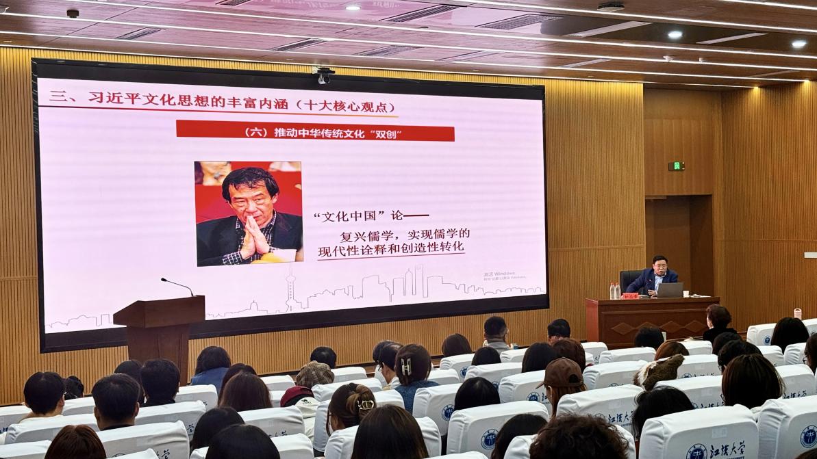 在系统解读习近平文化思想十个坚持的丰富内涵时,杜教授重点分析了坚持党对宣传思想文化工作的领导、坚定文化自信、推动中华优秀传统文化创造性转化和创新性发展等核心要义。他结合高校实际指出,要坚持马克思主义在意识形态领域的指导地位,把社会主义核心价值观融入育人全过程。
