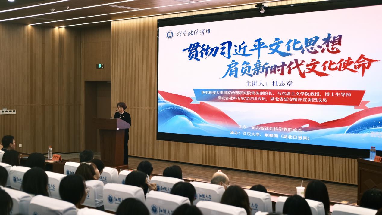 江大新闻网讯 目前全国上下正掀起深入学习贯彻党的二十届四中全会精神和《习近平谈治国理政》第五卷热潮,11月6日,“荆楚社科讲坛”走进江汉大学。湖北省社科专家宣讲团成员、华中科技大学杜志章教授应邀为我校师生作《贯彻习近平文化思想,肩负新时代文化使命》专题报告,推动党的创新理论在高校落地生根。
