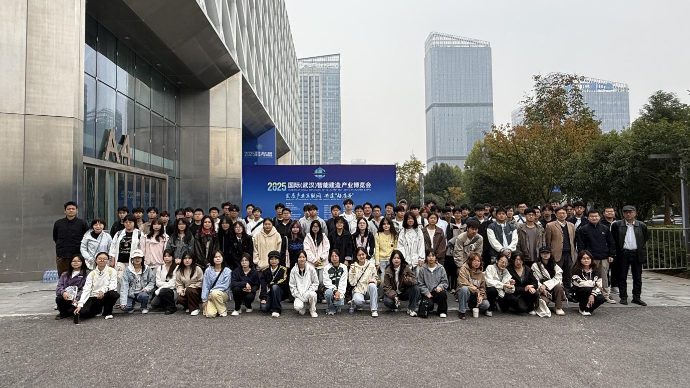师生在 2025 国际(武汉)智能建造产业博览会展馆前合影
