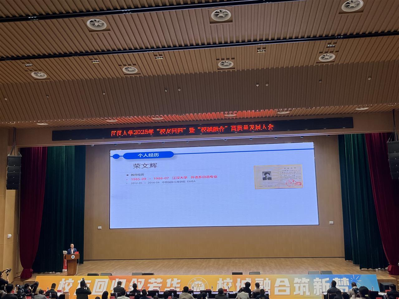 大会现场,荣文辉作为校友代表登台分享,如今身为九州通医疗器械集团董事长助理兼上海金山区创新医疗器械研究院院长,荣文辉直言在母校学到的知识让自己学以致用终身受用,帮助自己在工作上成长进步。1985年,他来到江汉大学求学,就读于日语专业,在老师的关心关怀下顺利完成学业。