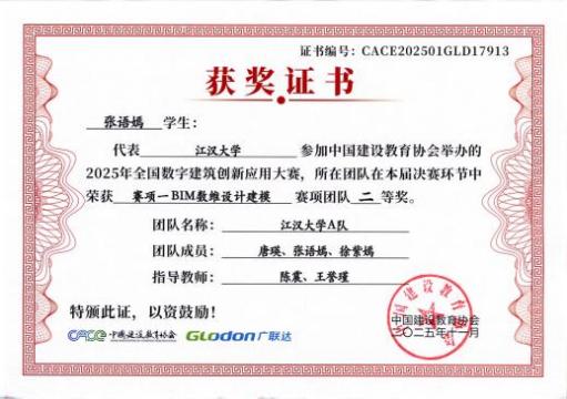 在学院陈震、王誉瑾两位老师悉心指导下,我校三支队伍历经数月精心备赛,顺利通过选拔赛,在总决赛中沉着冷静、奋勇拼搏,最终全部获奖,充分展现了我校学子扎实的专业基础和良好的团队协作能力。9名参赛选手还荣获由中国建设教育协会颁发的《住房城乡建设领域BIM应用专业技能证书》。