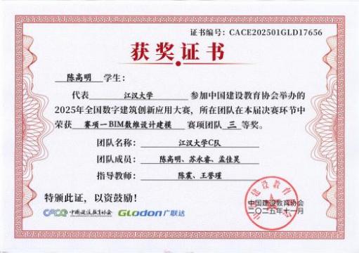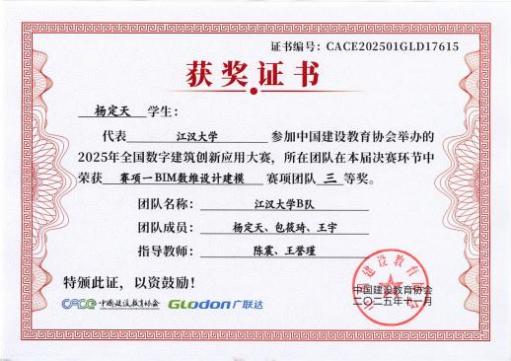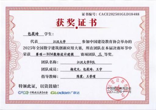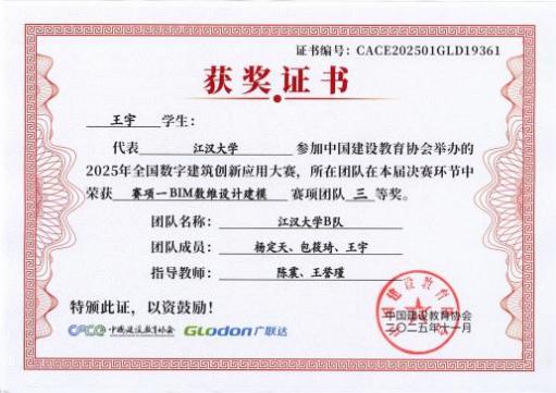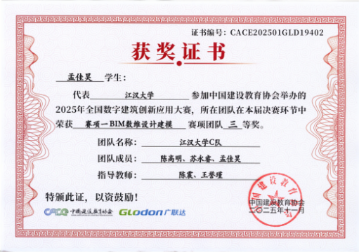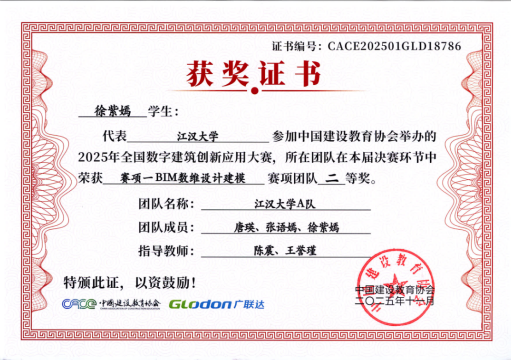 有关负责人表示,此次竞赛取得良好成绩,是学校长期坚持“以赛促教、以赛促学、以赛促创”育人理念的生动诠释。通过竞赛学生得以将课堂理论转化为实践能力,在真实项目模拟中掌握数字建筑技术的应用场景,有效增强了职场竞争力。学院将以此为契机,进一步深化教育教学改革,紧密聚焦数字建筑发展前沿,推动教学实践与行业需求实现同频共振,为应对建筑行业数字化转型需求,培养更多具备相关技能和知识的高素质人才贡献更多江大力量。