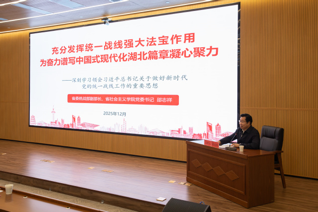 学习会上,邵志祥以《充分发挥统一战线强大法宝作用,为奋力谱写中国式现代化湖北篇章凝心聚力》为题,系统阐释了习近平总书记关于做好新时代党的统一战线工作的重要思想的真理力量与实践伟力,并结合湖北省实际,深入解读了新时代统战工作的新思想、新观点、新论断。报告主题鲜明、逻辑清晰,既有理论深度,又贴近工作实际,对学校进一步做好统战工作具有重要的指导意义。