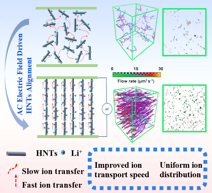 该研究得到了国家重点研发计划、湖北省自然科学基金创新群体和江汉大学学科创新项目等资助。研究自主研发了一套高压外电场辅助精密加工技术,这项电场加工技术不仅能精准调控纳米尺度填料的排布,还实现了聚合物网络的原位固化与结构锁定,最终在宏观上形成了贯穿电解质膜、低曲折度的离子“快速通道”。得益于这一独特的有序结构,所制备的柔性电解质膜在室温下获得了高达4.89×10⁻⁴ S cm⁻¹的离子电导率,并且由于离子流的均匀化,抑制了锂枝晶生长,显著提升了锂金属负极电池的可逆循环性能。