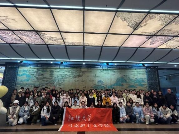 江大新闻网讯 近日,马克思主义学院马克思主义基本原理教研部7名教师带领来自商学院、人文学院、法学院、外语学院、设计学院、美术学院等10个学院的120余名本科生前往武汉博物馆,开展了一场以“探寻城市根脉”为主题的大思政课实践研学活动。