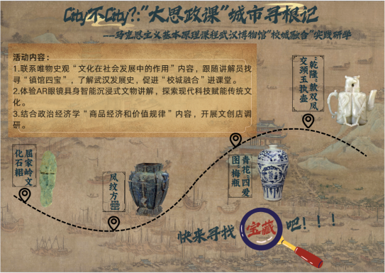 跟随讲解员的脚步,师生们遵循时代脉络,先后参观了“古代陶瓷艺术展”“明清书画艺术”“历代文物珍藏”“武汉古代历史陈列”等多个展厅。师生驻足于 “镇馆四宝”中的元青花四爱图梅瓶、江汉揽胜图等珍贵文物前,感受商周青铜的雄浑庄重、明清彩瓷的绚烂多姿;品味古城街巷的烟火气息和江汉朝宗的繁盛图景,对武汉的城市发展历史脉络进行了系统学习。这一过程将抽象的“唯物史观”与鲜活的地域历史实践相结合,让“校城融合”理念深度融入课堂、根植于心,实现了理论教学与文化实践的同频共振。