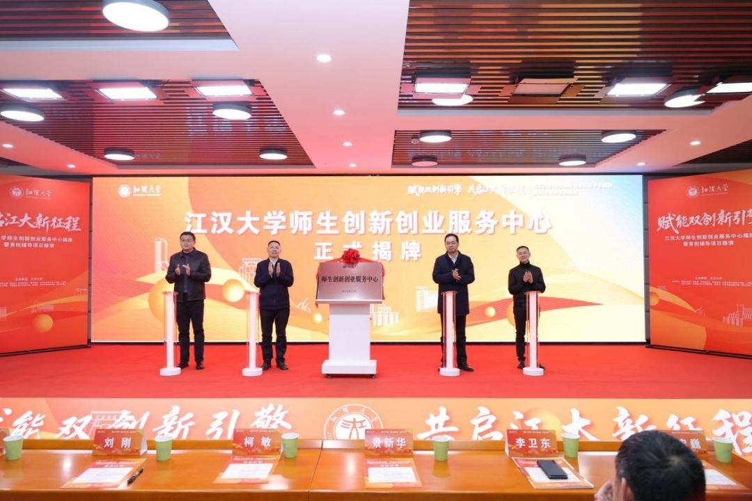 12月18日,江汉大学师生创新创业服务中心揭牌仪式暨首批辅导项目路演活动在校园内隆重举行。江汉大学与市科技创新局、市教育局、市人社局等单位有关负责人共同为“江汉大学师生创新创业服务中心”揭牌。