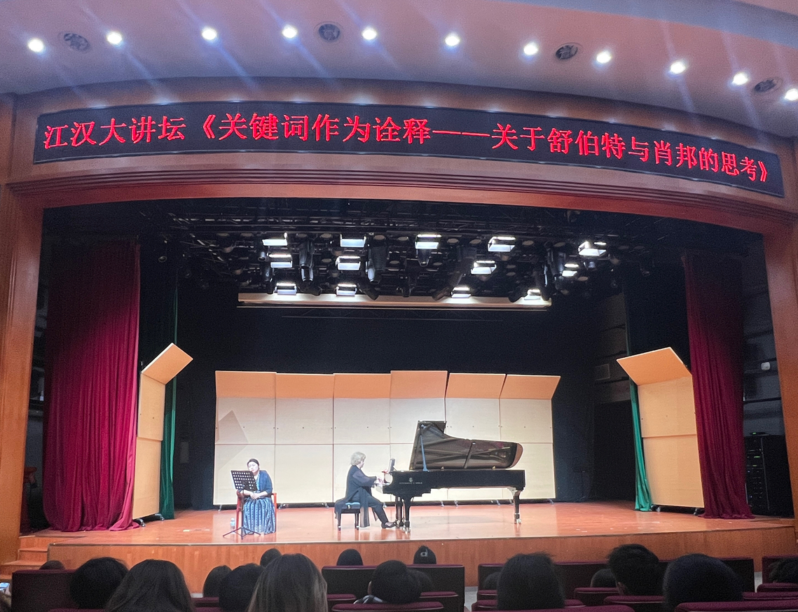 江大新闻网讯 日前,教务处、音乐学院联合主办的江汉大讲坛在音乐学院小音乐厅开讲。本次讲坛邀请德国代特莫尔德音乐学院钢琴系副主任艾莲娜·玛格琳娜·海特教授,带来题为“关键词作为诠释——关于舒伯特与肖邦的思考”的讲演音乐会,为我校师生呈现了一场兼具学术深度与艺术感染力的视听盛宴。