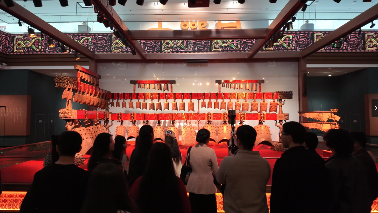 来自摩洛哥的国际学生迈赫迪感叹:“编钟的规模与音律之美令人惊叹,青铜器纹饰承载着古人智慧,这是一场跨越时空的对话。”国际学生代表纷纷分享感悟。土库曼斯坦学生古娜诗表示: “青铜器的精工细作改写了我的认知,数字展项让历史‘活’了起来。”摩洛哥学生法沙则对曾侯乙墓的考古价值印象深刻:“遗址实景与博物馆展陈相印证,仿佛触摸到两千年前曾国君主的礼乐生活。”