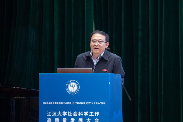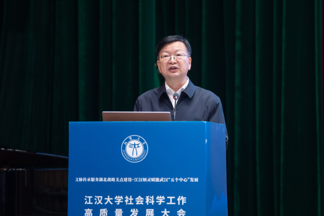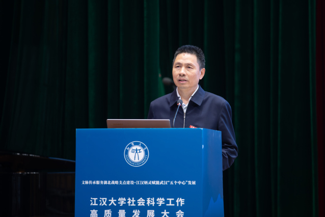 江大新闻网讯 4月16日上午,江汉大学社会科学工作高质量发展大会在科技创新大楼江大厅举行。会议以“文脉传承服务湖北战略支点建设·江汉炳灵赋能武汉‘五个中心’发展”为主题,总结学校近年来社科工作成效,分析问题及挑战,部署高质量发展重点工作任务。校党委书记覃道明,党委副书记、校长景新华出席会议并讲话。省社科联党组成员、副主席刘卫桥莅临会议并指导工作。