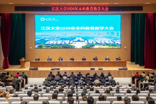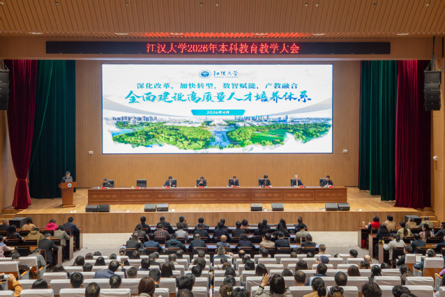 江大新闻网讯 4月23日上午,江汉大学2026年本科教育教学大会在科创大楼江大厅举行。会议总结了学校近年来本科教育教学工作成绩,剖析了面临的问题及挑战,并部署了下一阶段重点工作任务。校党委书记覃道明,党委副书记、校长景新华出席会议并讲话。