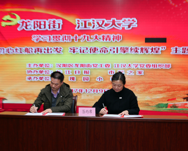 活动现场,马克思主义学院党总支书记王小净与龙阳街签订了学习贯彻“十九大精神”共建协议;我校校外成长导师、龙阳街出席党的十九大代表、武汉市第一聋哑学校副校长杨小玲和江汉大学商学院、人文学院的师生、龙阳街辖区的党员干部、居民们分享了参加党的十九大的经历与感悟;商学院“红色物业”龙阳实践班的大学生们和万科汉阳国际物业小管家们一起朗诵原创诗歌表现红色物业实践成果;人文学院学生用情景剧“新青年下乡”展示大学生走基层、进社区、增才干。杨小玲和人文学院播音主持与汉语国际教育联合党支部的党员教师何冬梅等被聘为汉阳区龙阳街新时代社区“研习社”理论宣讲员。