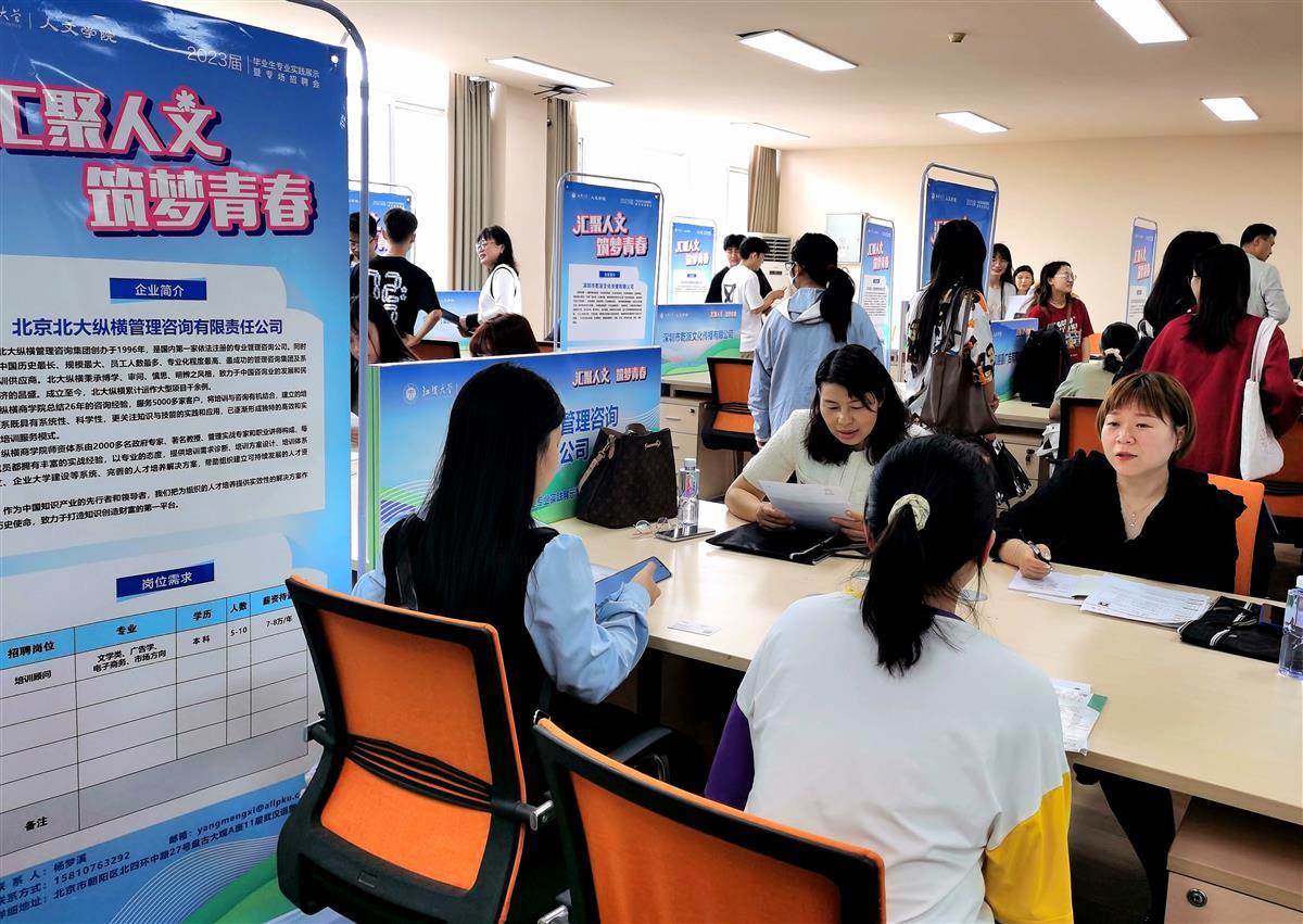 当天活动分为专场招聘、专业成果展示、专业展演等几个环节。在活动中心二楼专场招聘专区,数十家用人单位进场招聘,与毕业生们自主交流,不少毕业生当场与用人单位达成就业意向;三楼专业成果展示区则以大幅海报等形式,详尽展示了该学院汉语言文学、广告学、播音与主持、历史、文化产业管理等多个专业的专业成果,以及今年考取研究生的本科毕业生名单,吸引了众多师生驻足观看。