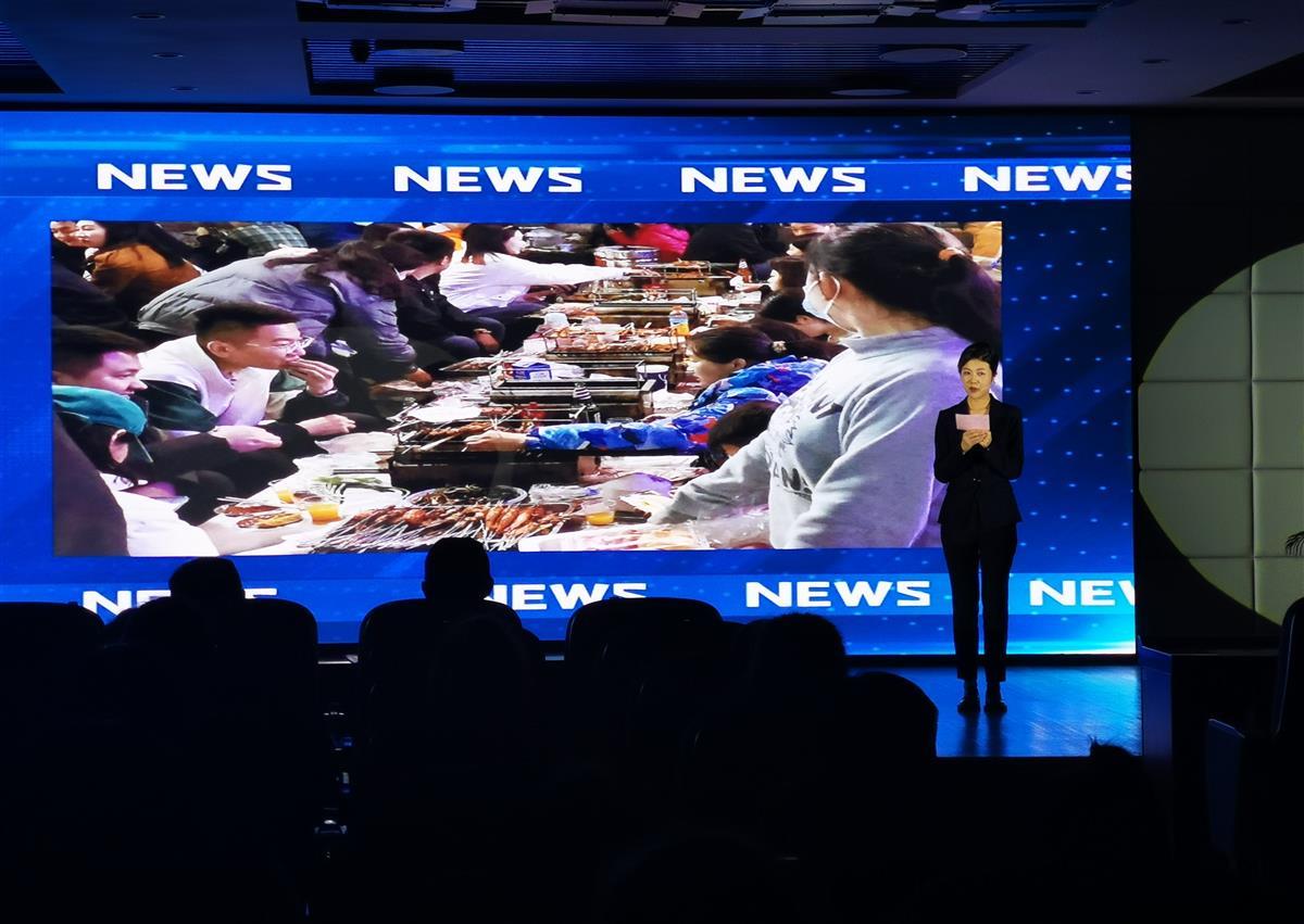 下午2时30分,师生们期待的专业展演拉开帷幕。该校人文学院2023届毕业生们纷纷登场,秀才艺,展风采。朗诵《青春对话》《我们的青春》、配音《声临其境》、情景剧 《以青春之名》、舞台短剧《党员登记表》、新闻播报《新闻30分》、体育解说《足球之夜》等一个个精彩的原创节目,充分显示了毕业学子的专业能力和艺术才华。尤其是模拟新闻播报、现场报道、配音、解说等节目,内容结合现实社会热点,表演有模有样,展示了同学们扎实的专业功底,赢得了台下师生们的阵阵热烈掌声。演出中,该院教师代表也登台以班主任寄语的形式,鼓励毕业生们努力奋斗,逐梦青春。