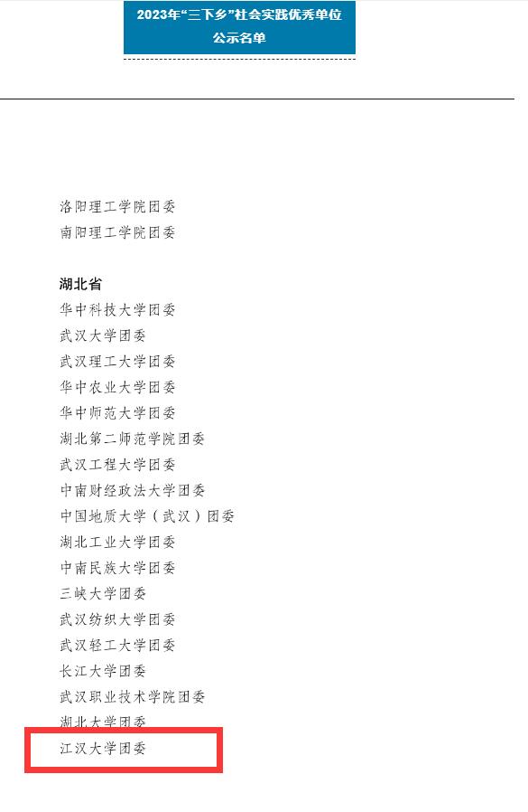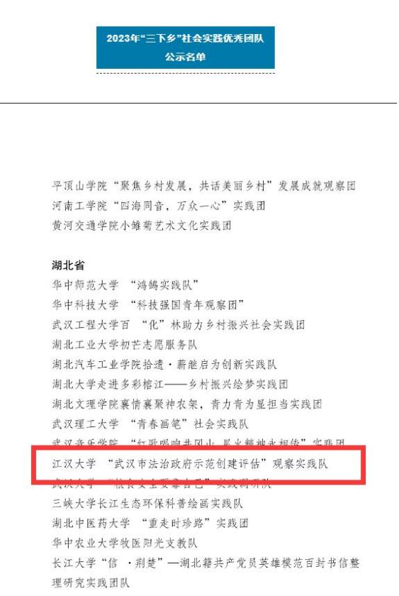 近日,2023年全国大中专学生志愿者暑期文化科技卫生“三下乡”社会实践活动总结通报结果公布,我校荣获2023年“三下乡”社会实践优秀单位,这是我校连续第二年荣膺团中央社会实践活动最高荣誉。我校法学院“武汉市法治政府示范创建评估”观察实践队被授予2023年“三下乡”社会实践优秀团队。