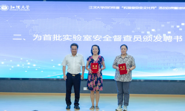 刘继延为学校首批实验室安全督查员光电材料与技术学院高级实验师张远方、医学部高级实验师李艳颁发聘书。他指出,学校历来高度重视实验室安全工作,健全了责任体系,完善了制度体系,构建了队伍体系,打造了教培体系,建立了信息化体系,建设了硬件设施体系,实验室安全工作的有效开展和成绩的取得,是参与实验室安全工作的全体师生共同努力的结果。同时,要清醒认识实验室安全工作的复杂性、艰巨性,我校实验室安全工作仍然存在需要改进的薄弱环节。他强调,要持续重视和加强实验室安全文化建设,持续落实好实验室安全制度,不断提升信息化管理水平,持续加强实验室安全风险排查和隐患整改。各学院、各单位、各部门要按照“全员、全面、全程”的要求广泛动员,提高广大师生活动参与面;全校师生要以饱满的热情积极投入到本次实验室安全文化月各项活动中,强化实验室安全意识,提升安全防范能力,自觉把各项实验室安全管理制度内化于心、外化于行,形成人人重视实验室安全的良好氛围,共同营造安全稳定的学习生活环境。