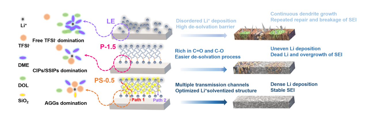 构造有机/无机复合凝胶电解质对于稳定锂金属电池的正极/负极电极界面具有重要意义。该研究以季戊四醇四丙烯酸酯(PETEA)作为凝胶电解质基底,通过引入气相二氧化硅(SiO2)作为凝胶电解质的填料通过原位聚合来改善锂金属/电解质的界面稳定性。通过一系列理论计算及光谱分析,证实了SiO2不仅可以提升凝胶聚合物的离子电导率,还改变了凝胶电解质中电解液锂离子的溶剂化结构,诱导了阴离子聚集体(AGGs)的产生,加快了锂离子的反应动力学。该研究为复合凝胶电解质中锂离子的溶剂化结构的研究提供了新见解,为开发高稳定性锂金属基凝胶电解质提供了新思路。