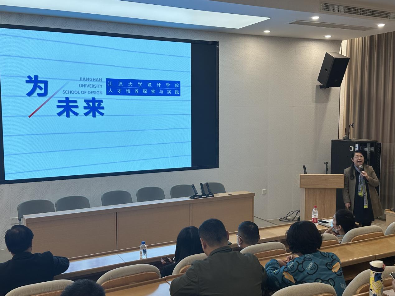 设计学院副院长曹琳作了《为未来——江汉大学设计学院人才培养探索与实践》的主题发言。她以如何培养复合型应用人才、如何打破传统设计教育格局、如何将新科技与新设计对接、如何培养学生社会责任意识、如何丰富学生第二课堂、如何培养学生自主创业能力等问题为切入点,引入设计学院专业人才培养改革实践破局之道。从设计类专业人才培养顶层设计、课堂教学赋能创新、全员协同育人等方面系统介绍了人才培养改革思路创新、教育教学方法创新、协同育人理念模式创新,生动讲述了对“壬”字形培养框架、整合设计实验班、项目式教学、校企协同育人、学生活动品牌等具有鲜明特色的教育改革实践案例。